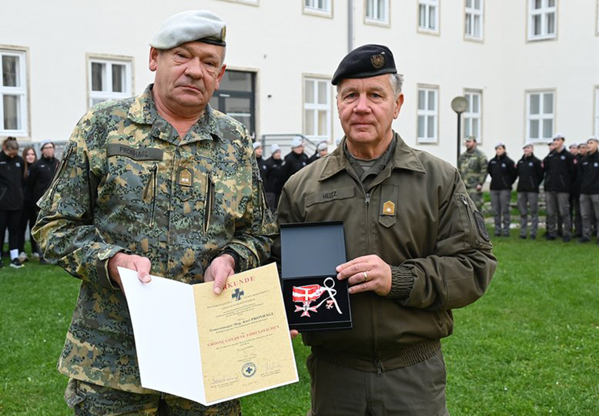 Am 20. Oktober konnte den beiden verantwortlichen Herren der Theresianischen Militärakademie (TherMilAk), Genrealmajor Karl Pronhagl, Kommandant der TherMilAk und Oberst Wolfgang Gröbming, Kommandant des Schulbataillons (BHAK Fü&Si) vom LGF Wien, Brigadier i.R. Claus Heitz, ihre bereits seit langem avisierten Auszeichnungen bei der Flaggenparade des Schulbataillons verliehen werden.