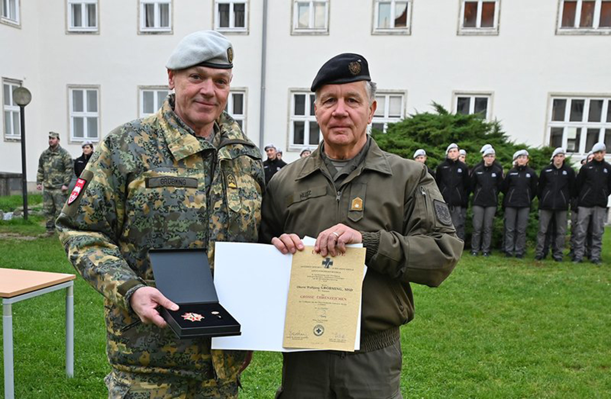 Oberst Wolfgang Gröbming wird das Große Ehrenkreuz des ÖSK verliehen.