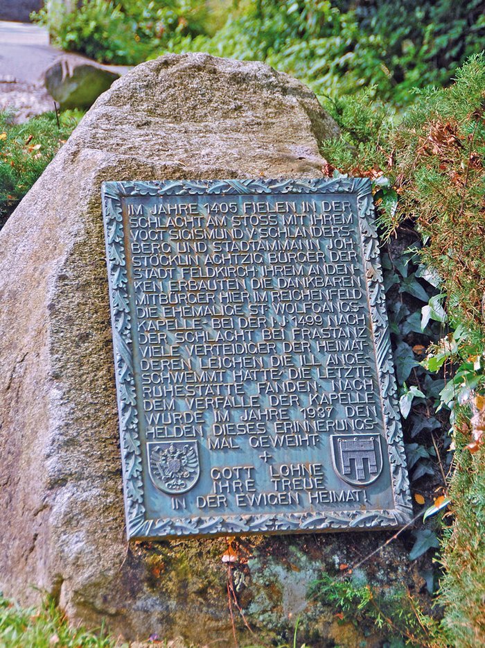 Gedenktafel an der Duxgasse in Erinnerung an die Gefallenen von 1405 (Schlacht am Stoß) und 1499 (Schlacht bei Frastanz) sowie die ehemalige St. Wolfgangskapelle in Feldkirch-Tisis