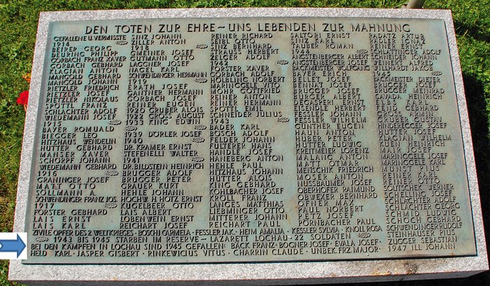 Ortsfriedhof Lochau: Kriegerdenkmal mit Kriegsgräbern mit vier Gefallenen der ehemaligen deutschen Wehrmacht – im Bild die Gedenktafel unter dem Kriegerdenkmal.