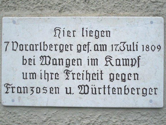 Sammelgrab – an der Außenseite der Kapelle weist eine Gedenktafel auf die sieben 1809 gefallenen und hier beerdigten Vorarlberger hin.