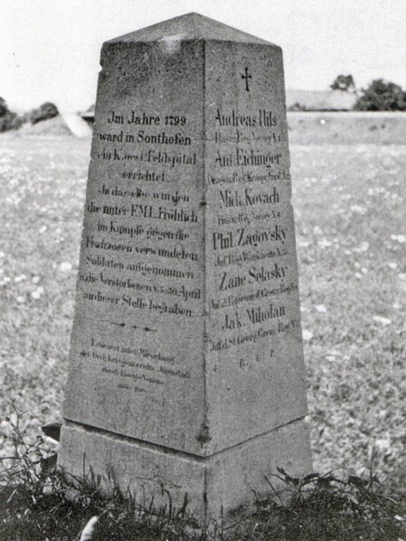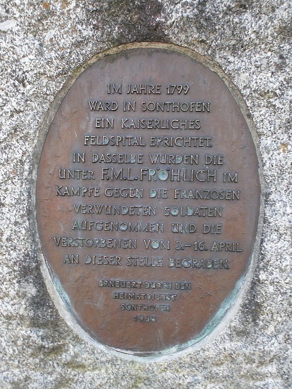 Sammelgrab – am Illerdamm wurden zehn 1799 im Lazarett verstorbene österreichische Soldeten aus der Militärgrenze bestattet. Bronzetafel auf dem neuen Gedenkstein.